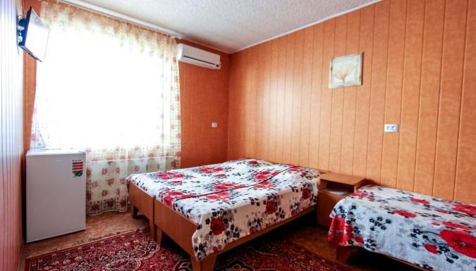 Телевизор, холодильник, кондиционер, туалет, душ в номере, 1 двуспальная кровать, 2 односпальных кровати