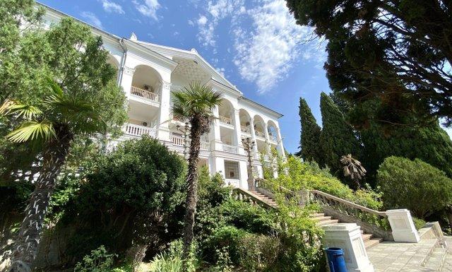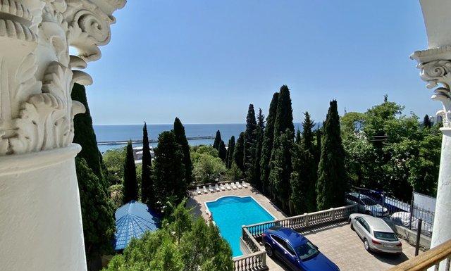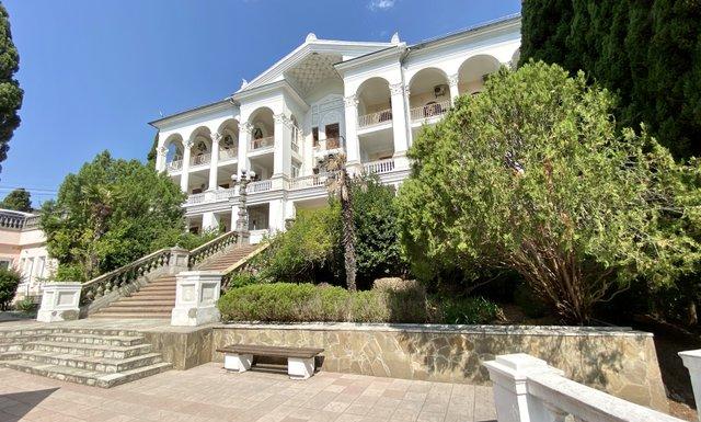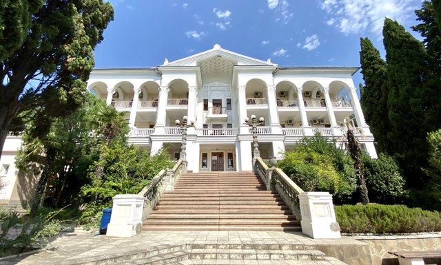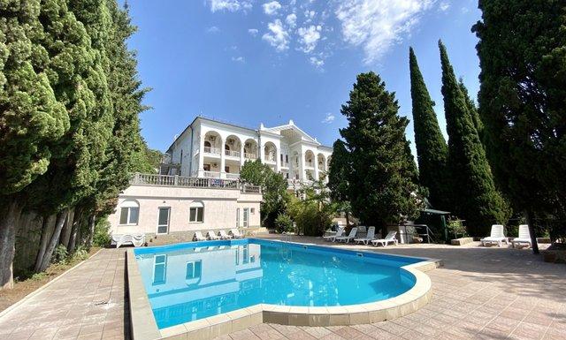 Отель занимает красивый трехэтажный особняк с белоснежными колоннами и балюстрадами, расположенный среди зеленого парка с кипарисами.