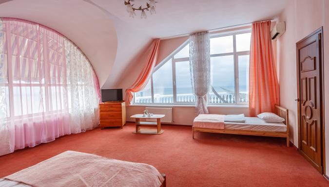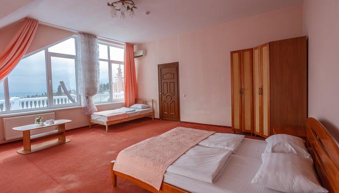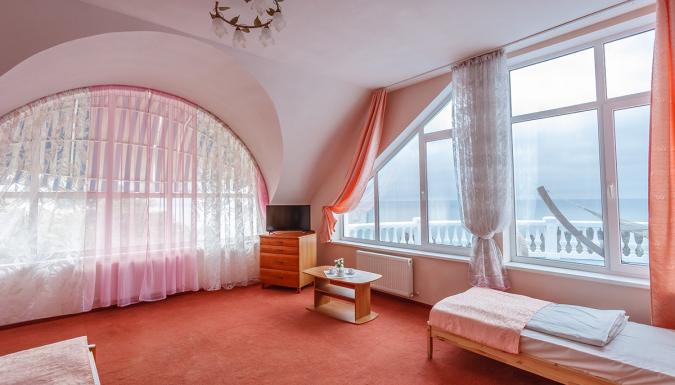 Уютные номера, полностью укомплектованы всем необходимым. Из окон большей части номеров открывается изумительной красоты вид на крымское побережье или на прекрасный парк отеля. Все комнаты имеют приятный интерьер в классическом стиле. Жилой фонд включает в себя 46 номеров, среди которых встречаются как Эконом-варианты, Стандарты, Семейные, так и номера Улучшенной категории. В каждом номере независимо от степени комфорта есть собственный санузел с душем, кондиционер, мини-холодильник и телевизор, в некоторых комнатах имеются балконы или терраса.