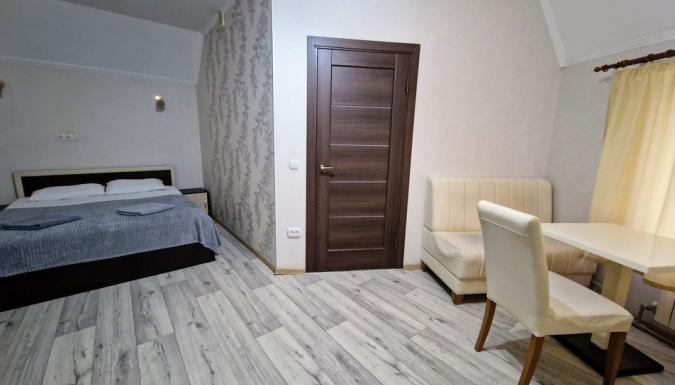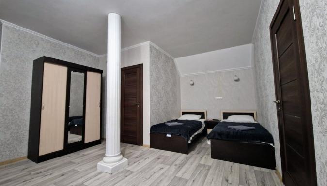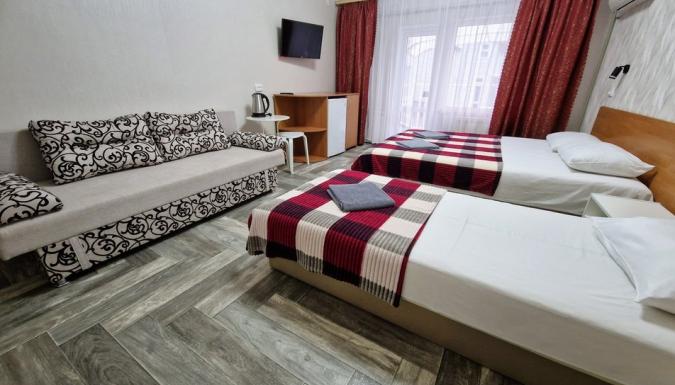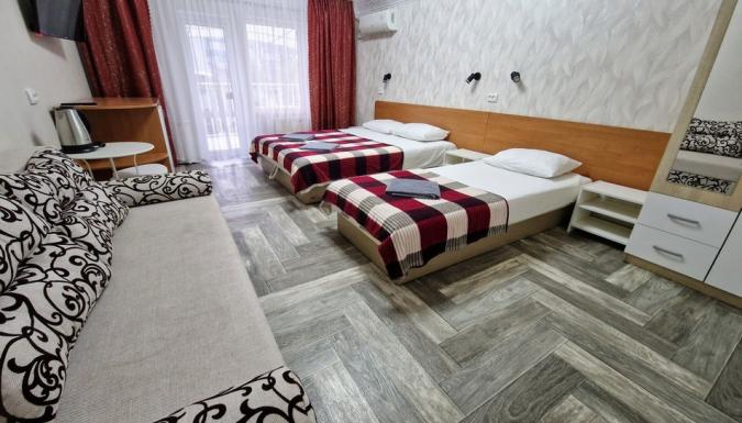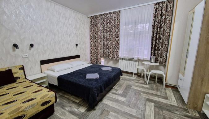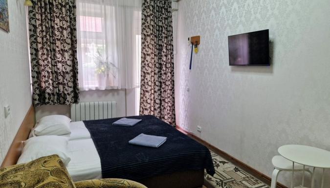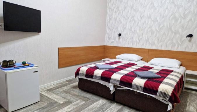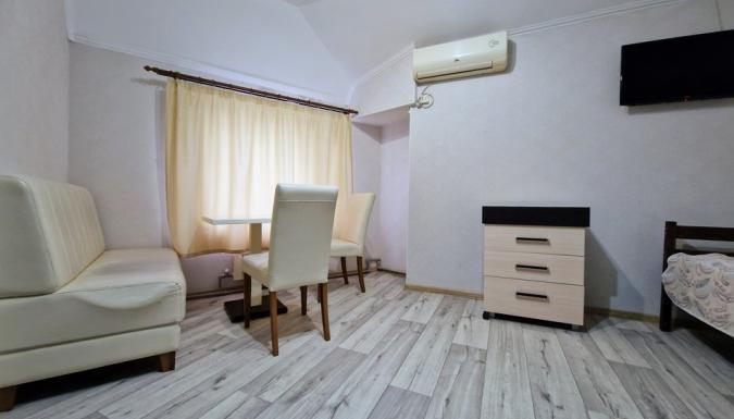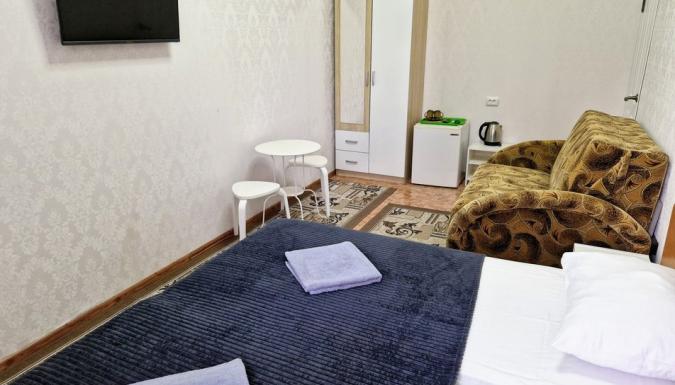 Комплект мебели, кондиционер, холодильник, ЖК ТВ (кабельное цифровое ТВ 104 канала), wi-fi (ограничение скорости на одно устройство — 10 mbit/s), сейф, фумигатор, фен(по требованию), посуда, чайник, штопор, индивидуальный санузел, холодная и горячая вода постоянно, без перебоев, косметический мини-набор для душа при заселении в летний сезон.