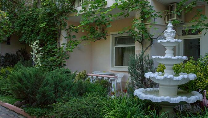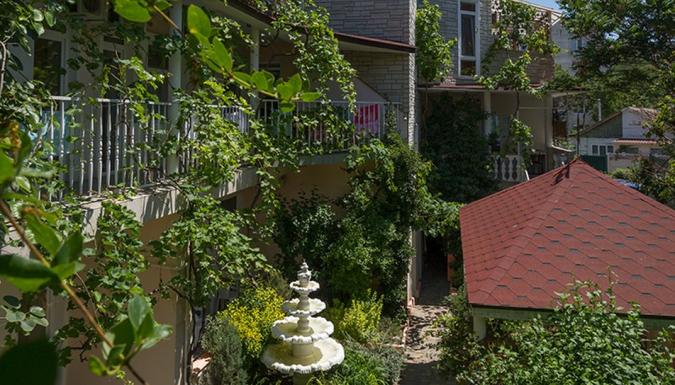 Территория гостевого дома «На Украинской» утопает в зелёных насаждениях. На клумбах много цветов и вечнозелёных растений. Растения создают неповторимое ощущение свежести и прохлады. Декоративной изюминкой дворика является альпийская горка. Балконы второго и третьего этажей находятся в тени виноградных лоз. С них открывается вид на горный хребет «Тепе-Оба». Все окна выходят во дворик.