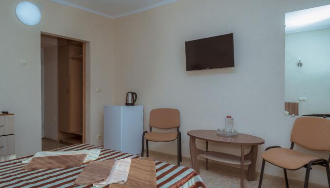 На территории санатория находится основной пятиэтажный корпус с лифтом, насчитывающий 99 номеров. Во всех номерах санатория есть отдельный санузел с душем и нужная бытовая техника: кондиционер, холодильник, ТВ, другие удобства, доступ к Wi-Fi возможен в холлах. К услугам гостей: бесплатная охраняемая парковка, сувенирный магазин, гостиничные службы, столовая и фито-бар, бассейн с подогревом, кабинет массажа, спортивные площадки.