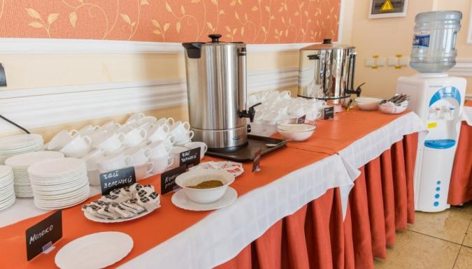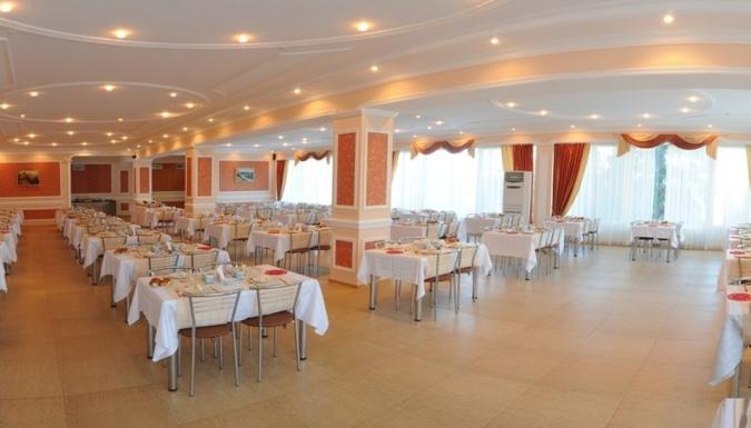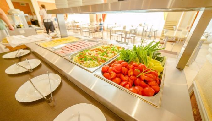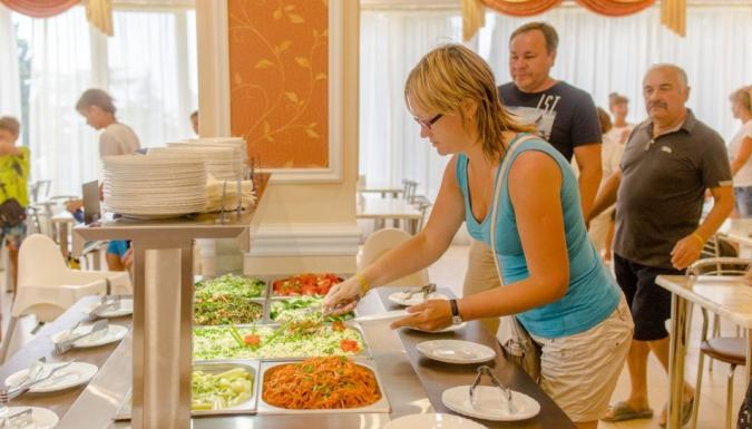 питание по системе «Все включено» в ресторане «Алустон» на протяжении всего дня с 07:30 до 20:00 с постепенной сменой ассортимента предлагаемых блюд: салаты, горячие и холодные закуски, первые и вторые блюда, кондитерские изделия и фрукты; ассортимент горячих и прохладительных напитков: чай, кофе, компот, каркаде, а также ассортимент алкогольных напитков: игристый напиток (сидр), разливное пиво, красное и белое вино местных производителей (с 11:00 до 20:00). В баре «Приморский» с 11:00 до 23:00 ежедневно игристый напиток (сидр), красное и белое вино местных производителей, пиво; ассортимент безалкогольных напитков: компот, каркаде, лимонад; чайная станция: чай, кофе, печенье, пряники, баранки, с 11.00 до 20:00 - сладкая вата, мягкое мороженое, попкорн.