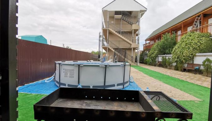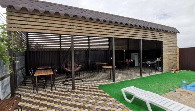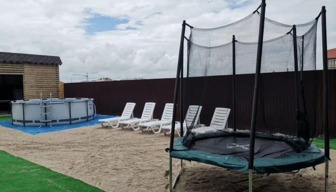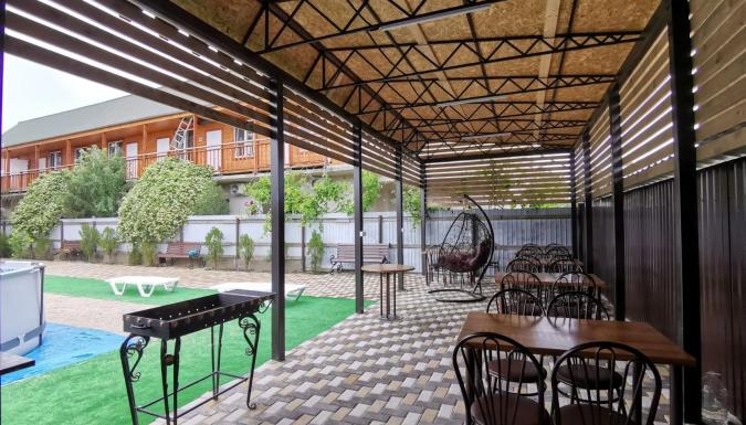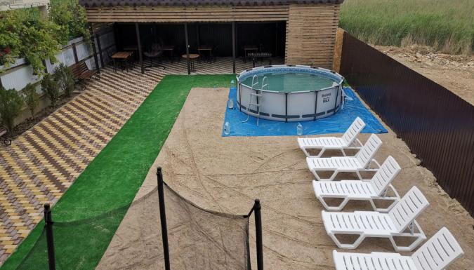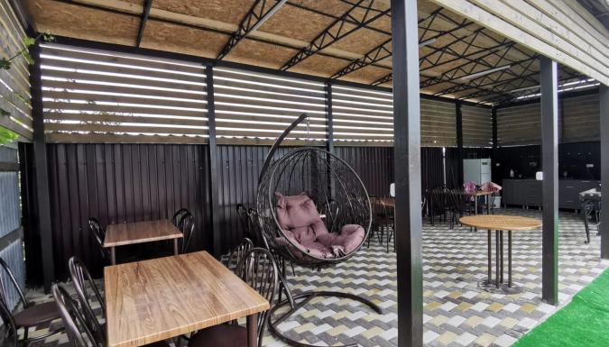 Для комфортного отдыха гостей просторный озеленённый двор с беседкой и кухней. На кухне имеется газовая панель, раковина, духовка, микроволновка, кофемашина, общий холодильник, казан и все кухонные принадлежности. На просторном дворе настоящая зелень, а для удобного времяпровождения на территории двора для наших гостей много приятных плюшек: детский комплекс и игрушки, каркасный бассейн, лавочки, шезлонги, гамак и даже кресло качалка. Есть и место для курения кальяна.