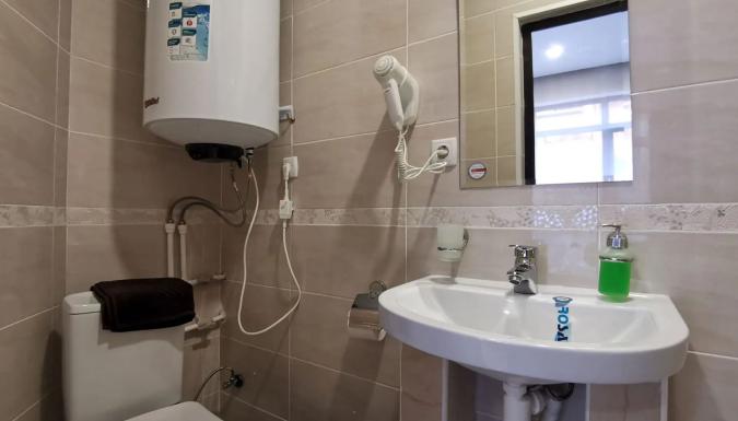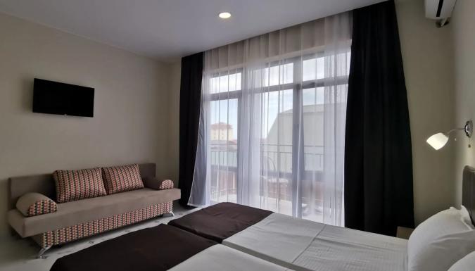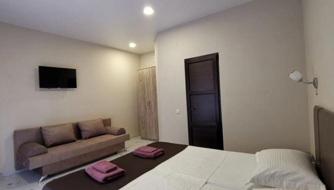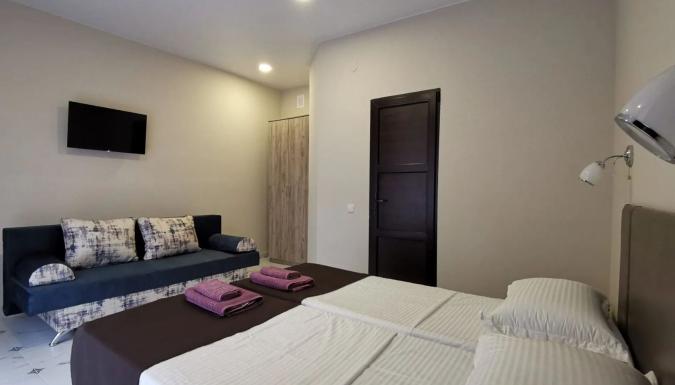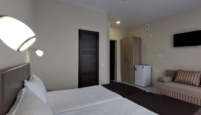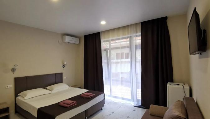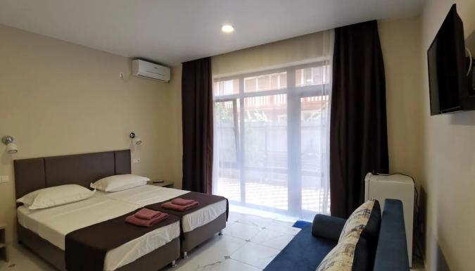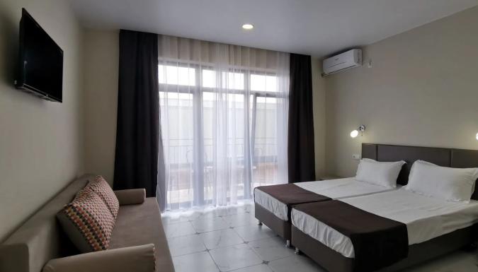 Для размещения предлагаются современные номера с витражными окнами и современным ремонтом и индивидуальными санузлами. В номерах односпальные или двуспальная кровати, диван-кровать, стулья, шкаф, прикроватные тумбочки, стол, вешалка, зеркало, обеденная зона, кондиционер, холодильник, телевизор, ТВ, Wi-Fi интернет, фен