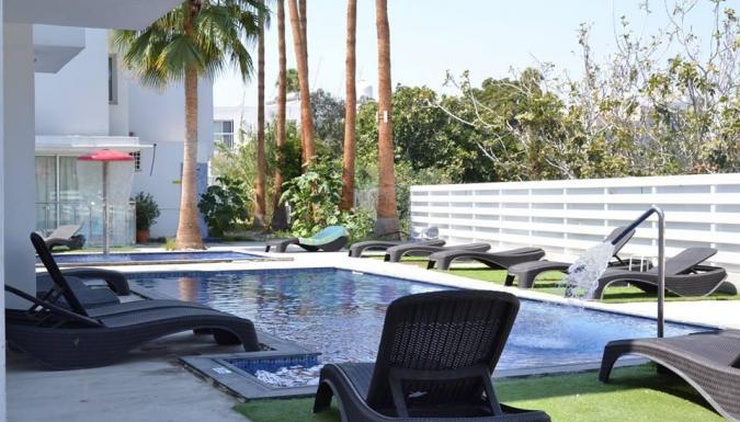 - шезлонги и зонты возле бассейна