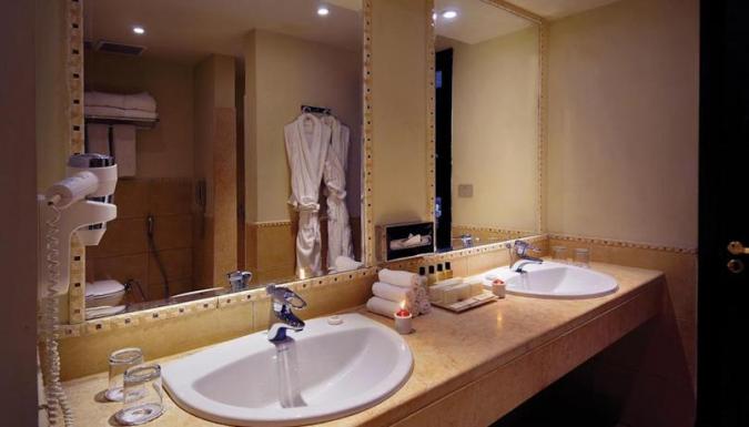- ванная комната + фен + туалетно-косметические принадлежности + халат + тапочки