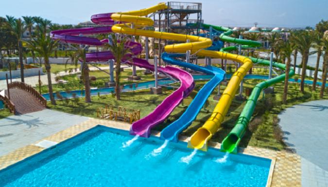 Аквапарк - 36 горок с тематическими зонами: Space Bowel, Magic Loop Slide, Boomrange Slide, Spiral Slides, Whizzard Slide, Lazy River, and Aqua Tour for kids.