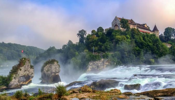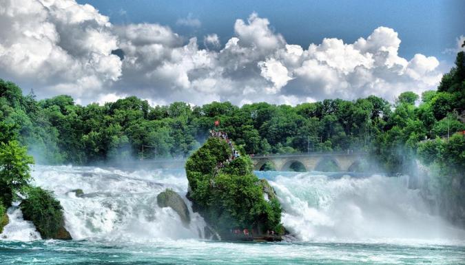 Начнем с главной «водной» достопримечательности Швейцарии - РЕЙНСКОГО ВОДОПАДА. Это место беспрестанного шума, мельчайшей водяной пыли в воздухе и десятков маленьких радуг, играющих на брызгах. С шириной 150 метров и высотой 23 метра, Рейнский водопад с гордостью носит звание самого большого по объёму низвергающейся воды водопада Европы.