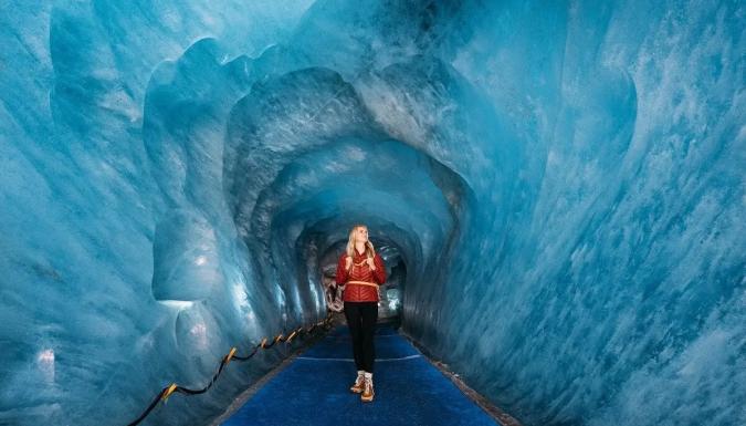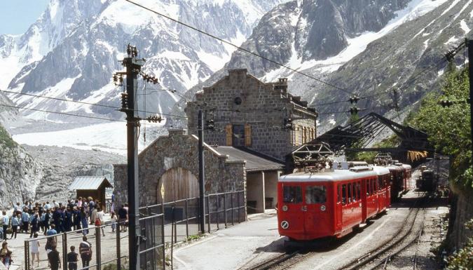 Для желающих поездка на железной дороге к крупнейшему леднику Франции-Мер-де-Глас (билет=42 евро/взр, 35 евро/дети до 14 лет). Красный поезд движется (20 мин) по мостам, через туннели, поднимая Вас вверх горного массива с потрясающими видами на долину и окружающие снежные пики. Из-за изменения климата ледник стремительно тает, и, если в 1988 году, чтобы ступить на ледник надо было спустить только на 3 ступенька, сейчас надо пройти 600 ступенек (минут 25). Внутри ледника вырублена «ледяная пещера» со снежными скульптурами с атмосферным голубым светом. Интересно, что каждый год пещеру создают заново на новом месте, так как ледник движется, меняя свою форму.