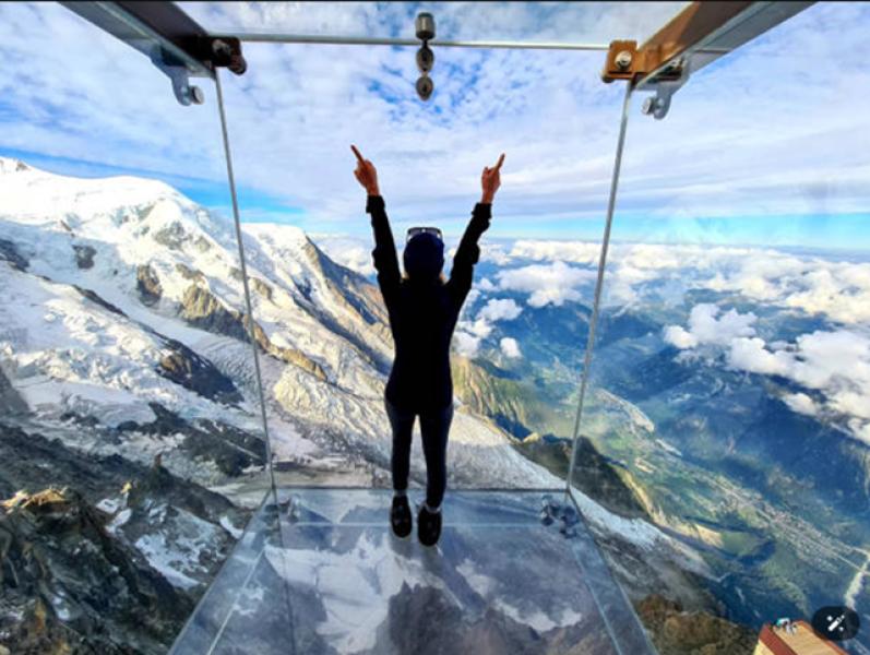 - подъем пересекает ледник Ле Пелерин к Северной стене Эгюий-дю-Миди (3.842 м). На станции терраса с невероятной панорамой в 360* с потрясающими видами на Альпы! В ясный день можно видеть и Маттерхорн, Монта Роза и Гран-Комбен.