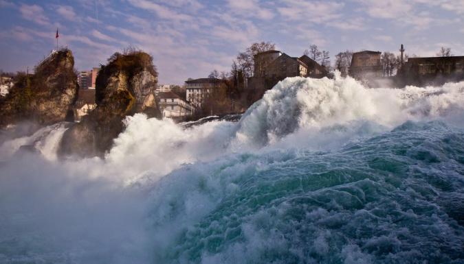 Начнем с главной «водной» достопримечательности Швейцарии - РЕЙНСКОГО ВОДОПАДА. Это место беспрестанного шума, мельчайшей водяной пыли в воздухе и десятков маленьких радуг, играющих на брызгах. С шириной 150 метров и высотой 23 метра, Рейнский водопад с гордостью носит звание самого большого по объёму низвергающейся воды водопада Европы.