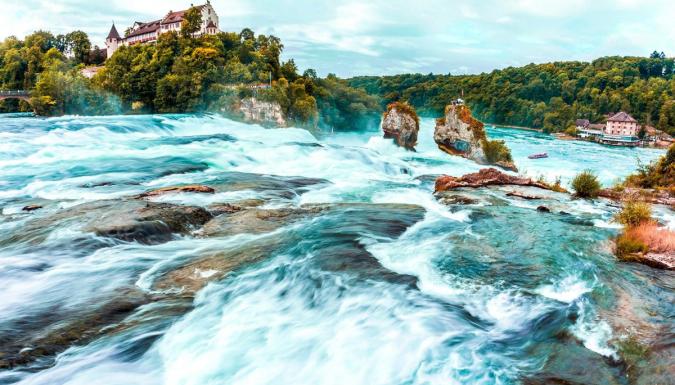 Начнем с главной «водной» достопримечательности Швейцарии - РЕЙНСКОГО ВОДОПАДА. Это место беспрестанного шума, мельчайшей водяной пыли в воздухе и десятков маленьких радуг, играющих на брызгах. С шириной 150 метров и высотой 23 метра, Рейнский водопад с гордостью носит звание самого большого по объёму низвергающейся воды водопада Европы.