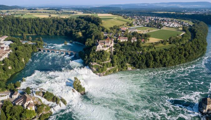 Начнем с главной «водной» достопримечательности Швейцарии - РЕЙНСКОГО ВОДОПАДА. Это место беспрестанного шума, мельчайшей водяной пыли в воздухе и десятков маленьких радуг, играющих на брызгах. С шириной 150 метров и высотой 23 метра, Рейнский водопад с гордостью носит звание самого большого по объёму низвергающейся воды водопада Европы.
