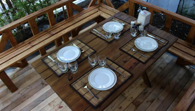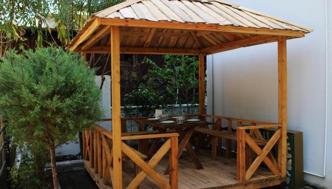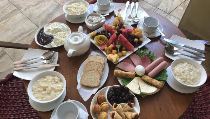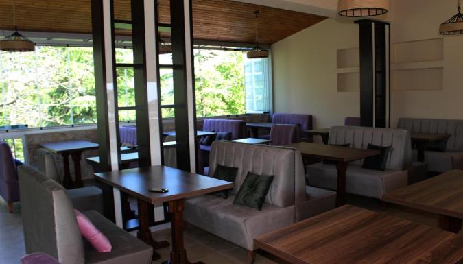 В ресторане отеля подаются различные блюда грузинской кухни. Гости могут выпить напиток в баре или отдохнуть на террасе. Вечером в отеле играет живая музыка.