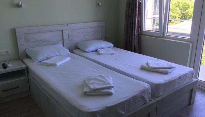 Двух и трехместные номера с французским или обычным большим балконом. Столовая на цокольном этаже, где предлагается трехразовое питание с алкогольными местными напитками на завтрак. Семейных номеров нет, максимум трехместное размещение в отеле. На улице на территории есть зоны отдыха (столы и стулья под навесом).