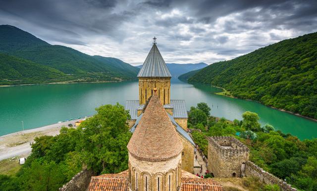 Осмотр средневековой Крепости Ананури , возвышающейся над лазурным Жинвальским водохранилищем.