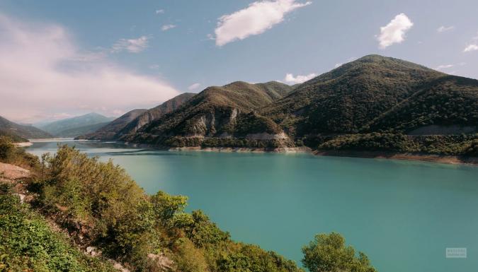 Жинвальское горное водохранилище, вода которого имеет необыкновенный бирюзовый цвет;