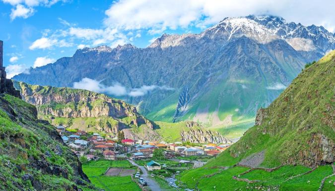 У подножья Казбеги находится конечная цель нашего путешествия. Поселок Степанцминда (Казбеги). Это уникальная климатическая зона. Поселок расположен на левом берегу еще молодого, но уже бурного Терека, начинающего свой путь к Каспийскому морю с этих мест. Помимо прекрасного вида на гору Казбек, удивительной красоты окрестности и чистейший горный воздух, поселок может похвастаться уникальными памятниками культуры.