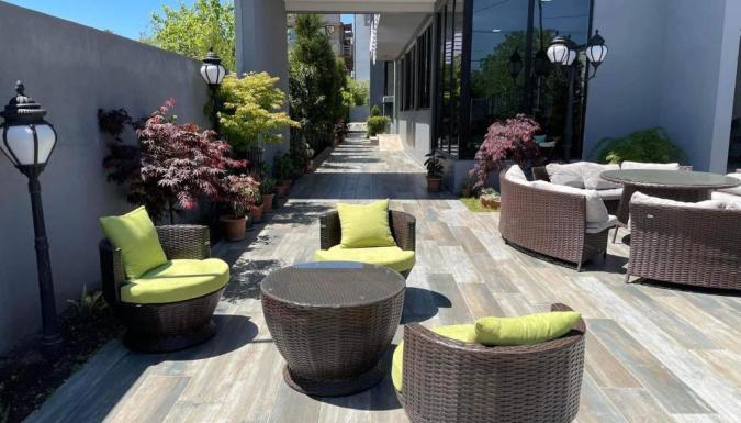 На территории открытый бассейн, шезлонги, зона отдыха, уютная лаунж зона.