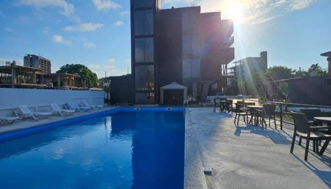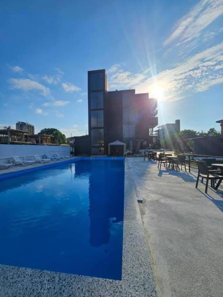 На территории отеля: столовая, бассейн, зоны отдыха со столиками;