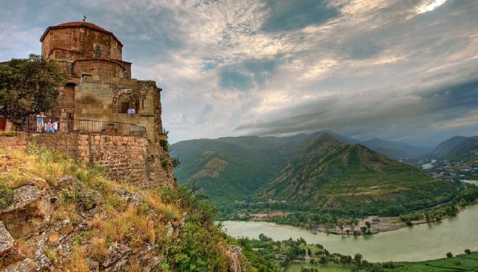 Монастырь Джвари («Крест») VI века, стоящий на вершине скалы, откуда открывается легендарный вид на слияние рек Куры и Арагви, вдохновивший Лермонтова.