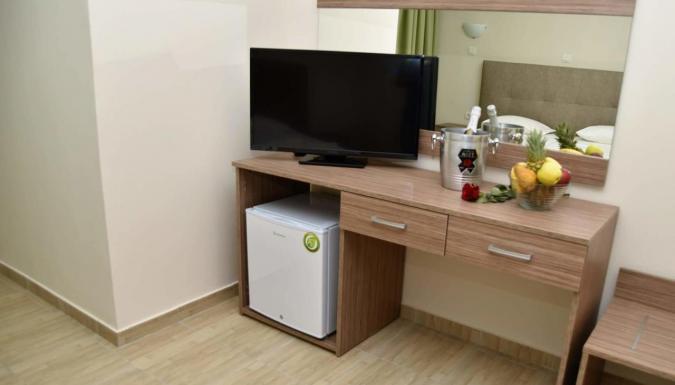 Кондиционер (за доплату), спутниковое ТВ (росcийские каналы), холодильник, телефон, ванна/душ, фен и утюг (по запросу), балкон/терраса.