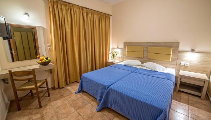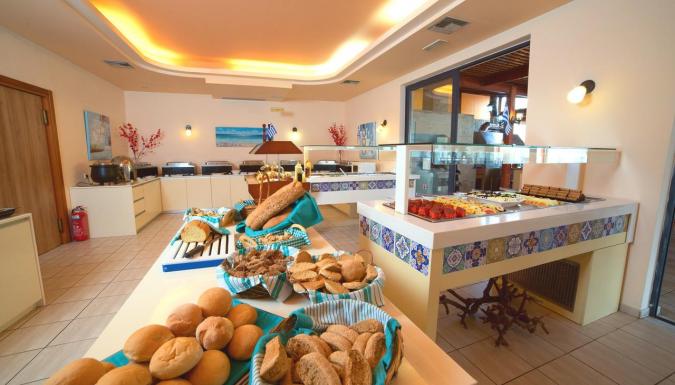 Каждое утро в обеденной зоне подают завтрак «шведский стол». В ресторане отеля предлагаются традиционные блюда греческой кухни, а также сытные средиземноморские кушанья из местных продуктов, приготовленные с использованием оливкового масла, местных трав, свежих овощей и фруктов. В баре с видом на бассейн предлагаются прохладительные напитки.