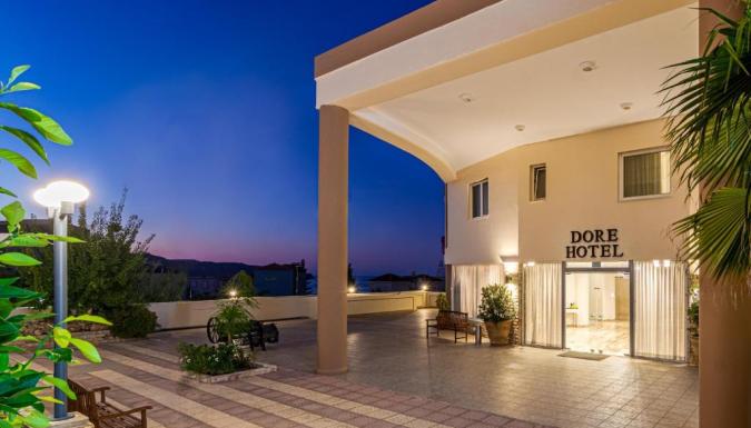 В ресторане отеля подают завтрак и ужин «шведский стол», традиционные блюда греческой кухни и закуски. В баре отеля Dore можно заказать кофе, напитки и коктейли.
