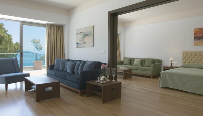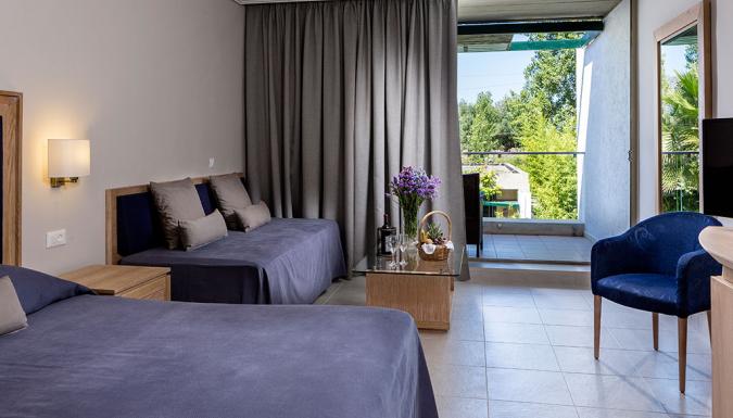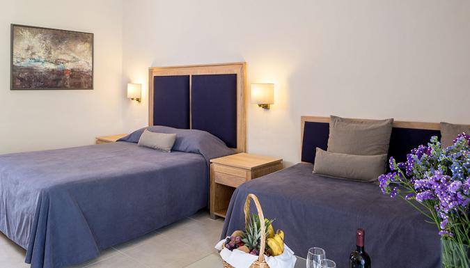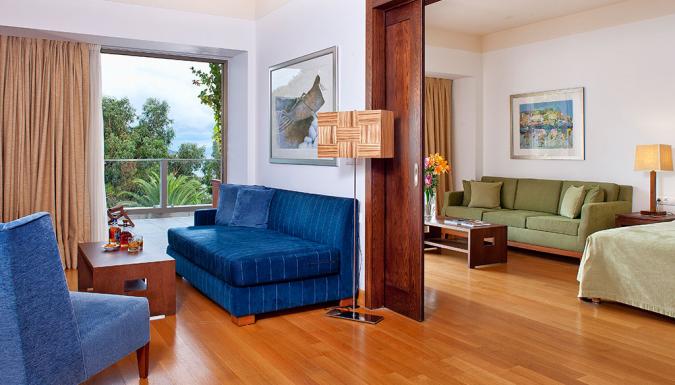 Family Room MB GV (~28 кв.м) Расположены на 2-ом этаже центрального здания. Спальня с двуспальной кроватью, гостиная с 2-мя отдельными диванами. Разделены раздвигающейся дверью. Набор для приготовления кофе/чая. По прибытии – бутылка вина и бутылка минеральной воды, фрукты.