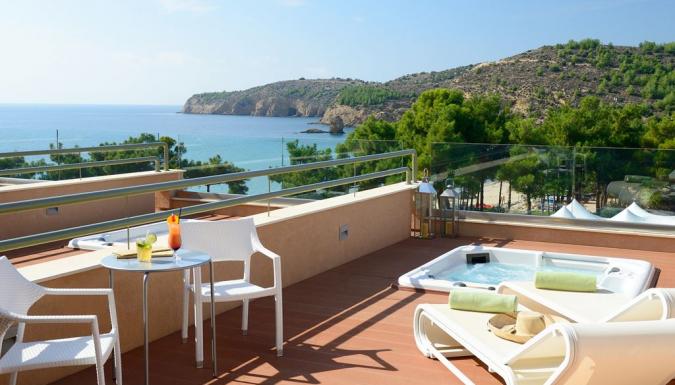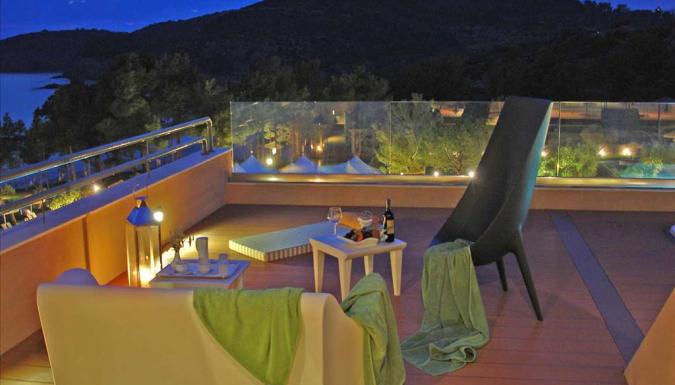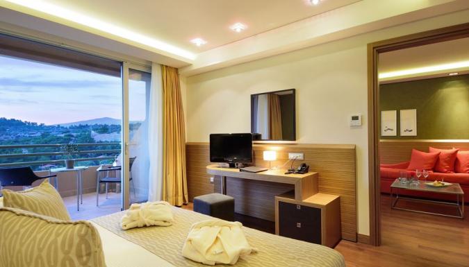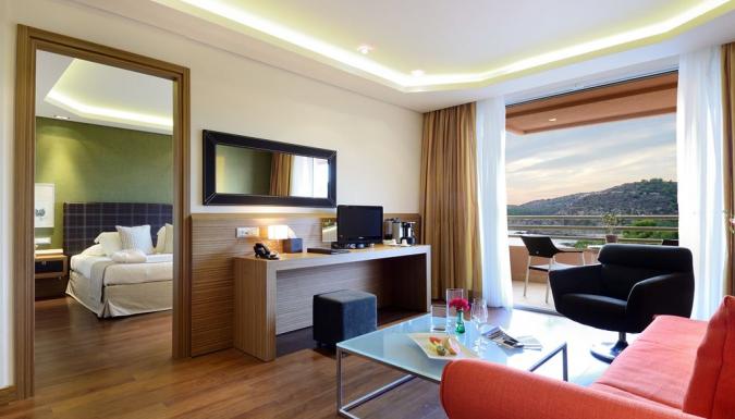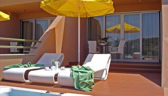 Suite Deluxe 2 отдельные комнаты, одна с двуспальной кроватью королевских размеров, салон (2 кресло-кровати), 2 телевизора LCD 32” и 26” (в спальне), кофе-машина Nespresso, электрический чайник, кофе/чай, халаты, полотенца для бассейна, тапочки для сауны. Веранда с джакузи, лежаки и зонт, 2 кресла.