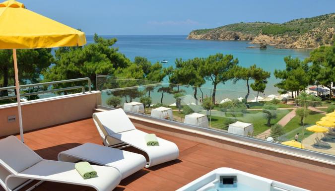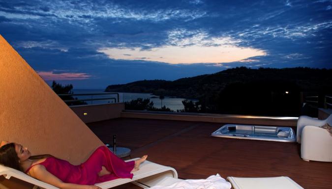 Double Executive SV Электрический чайник, кофе/чай, халаты, полотенца для бассейна, тапочки для сауны, большая веранда с джакузи, лежаки и зонт, 2 кресла.