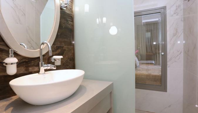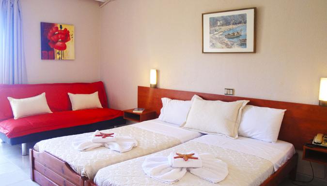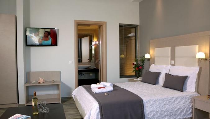 Deluxe Studios 4 pax Новые просторные студио, изысканный дизайн, полностью оборудованная кухня, двуспальная кровать, двуспальный диван-кровать и кресло-кровать для 4-го человека, телевизор Плазма (32’’), ванная комната (общий вход к раковине, слева душевая с дверью, справа WC с отдельной дверью).