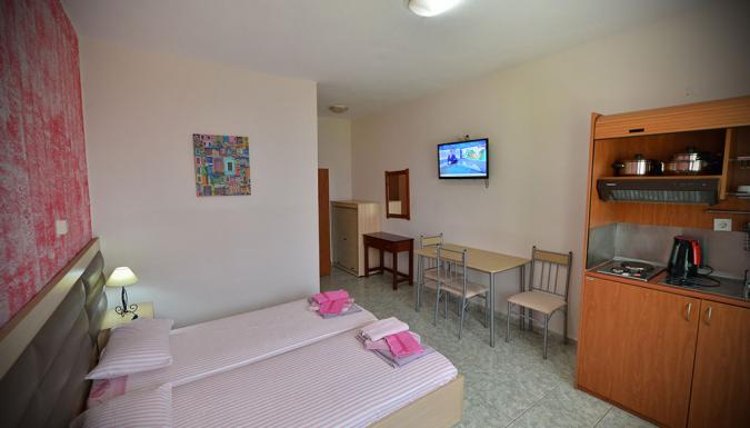 Балкон/терраса, ванна/душ - душ в двухместных и трехместных номерах, ванна - в четырехместных и семейных номерах, кондиционер, кухня небольшая кухня (плита с 2 глазками, посуда), столик, российский канал, спутниковое ТВ, телевизор, фен, холодильник, чайник электрический