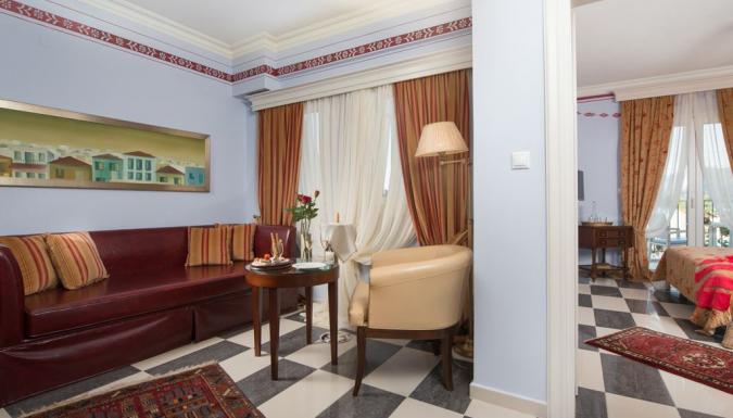 Junior Suite Двуспальная кровать, диван-кровать, журнальный столик, кресло, балкон с видом на море,