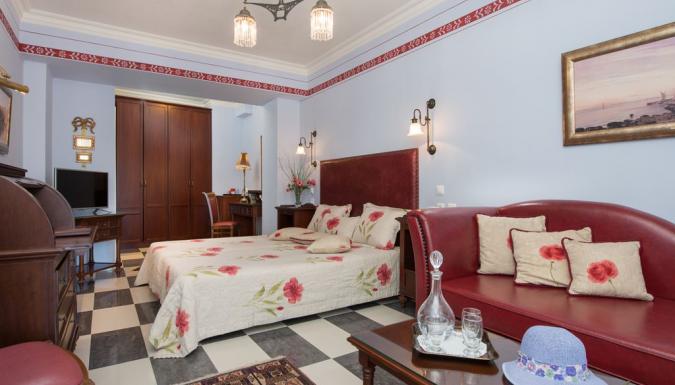 Suite 2 комнаты: спальня с двуспальной кроватью и гостиная, диван-кровать, 2 телевизора, 2 кондиционера, балкон с видом на море.