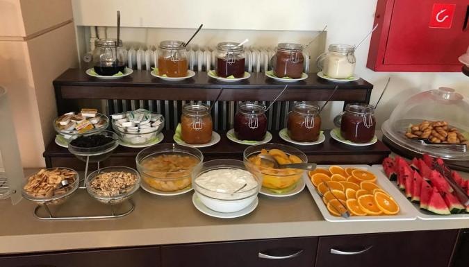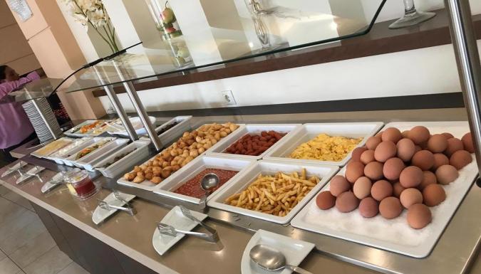 Завтрак – шведский стол, обед – меню (+ стакан вина, стакан апельсинового сока, вода – на человека), ужин – меню (+вода).