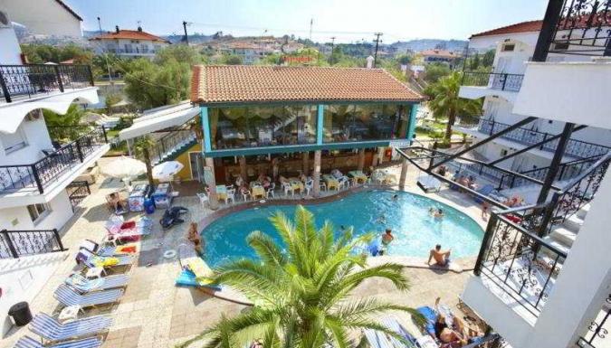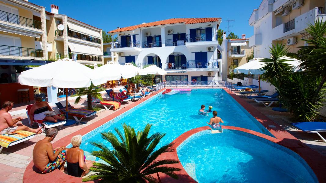 Отель расположен в нескольких шагах от центра поселка Ханиоти, в его тихой части. Рядом находятся многочисленные рестораны, бары и таверны, магазины и супермаркеты, детские и спортивная площадки. Отель подойдет для комфортного, экономичного отдыха.