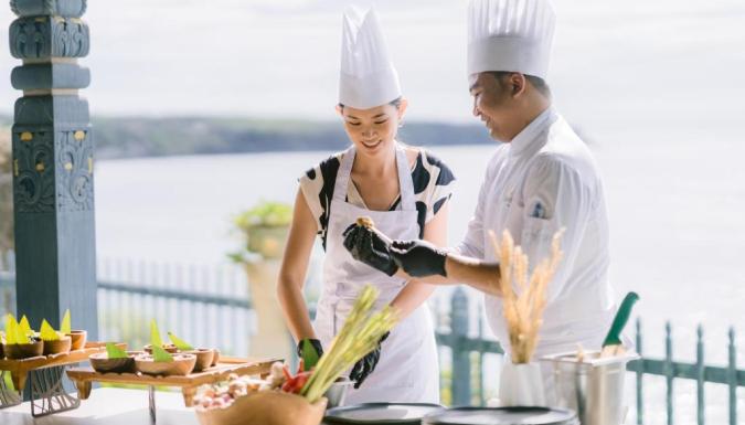 Ежедневно гостям предлагается завтрак «шведский стол», континентальный завтрак или азиатский завтрак. При Jumeirah Bali работает ресторан, где подают блюда американской кухни и блюда азиатской кухни. Гости могут попросить приготовить безлактозные, халяльные и безглютеновые блюда.