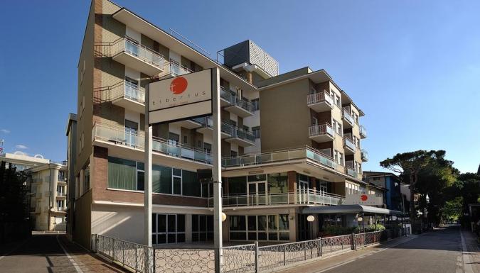В отеле есть 80 звукоизолированных номеров, 3 конференц-зала (от 10 до 100 мест)., парковка, детская комната, терраса перед отелем со столиками и стульями, есть семейные номера, территория отеля оборудована видеонаблюдением, на пляже предоставляется бесплатно пляжное оборудование. В отеле Tiberius подают континентальный завтрак «шведский стол» с домашней выпечкой и закусками. В ресторане подают блюда региональной романьольской и интернациональной кухни.