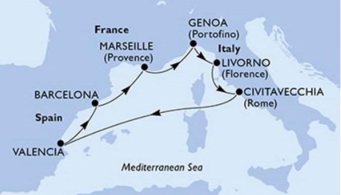Валенсия (Испания), Барселона (Испания), Марсель (Франция), Генуя (Италия), Ливорно (Италия), Чивитавеккья (Италия) . Визовая поддержка под запрос. Тариф указан с портовыми и сервисными сборами на 1-й тип каюты при 2-х размещении. Детям скидка.