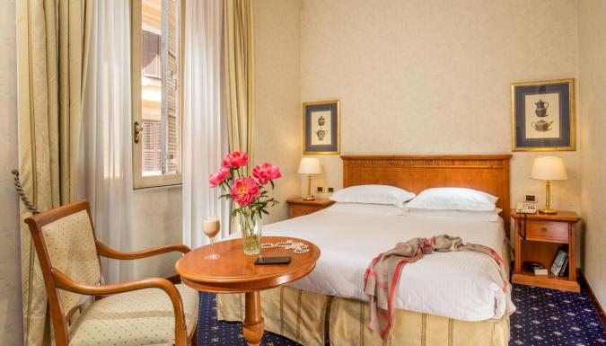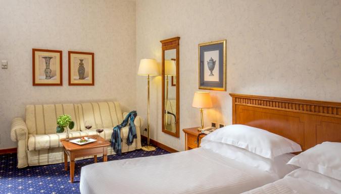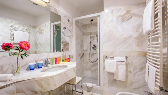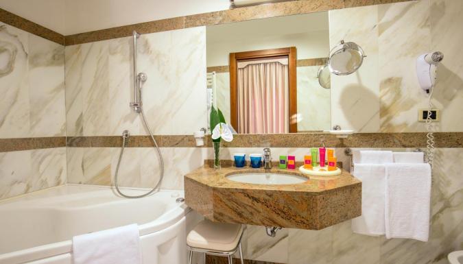 Номера отеля оформлены с большим вкусом. Ванные комнаты облицованы мрамором.
