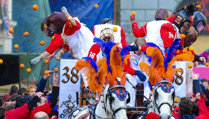Готовы к битве? Карнавал в Иврее — это знаменитая апельсиновая битва, символизирующая борьбу народа с тиранией. Тысячи людей в костюмах забрасывают друг друга 360 тоннами апельсинов! Улицы превращаются в бушующее оранжевое море. Это невероятно зрелищно, эксцентрично и весело! Энергия и адреналин зашкаливают — вы либо будете метать апельсины, либо активно за них болеть!