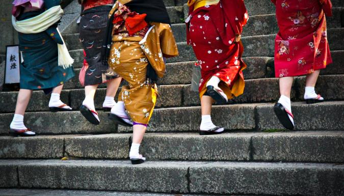 Район гейш "Гион" с аутентичной атмосферой времени, когда гейши развлекали своих гостей чаепитием, танцами, пением, чтением литературы и беседами на любые темы. Сегодня в этом квартале можно встретить современных японок, одетых в кимоно с традиционной прической и макияжем.