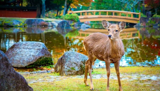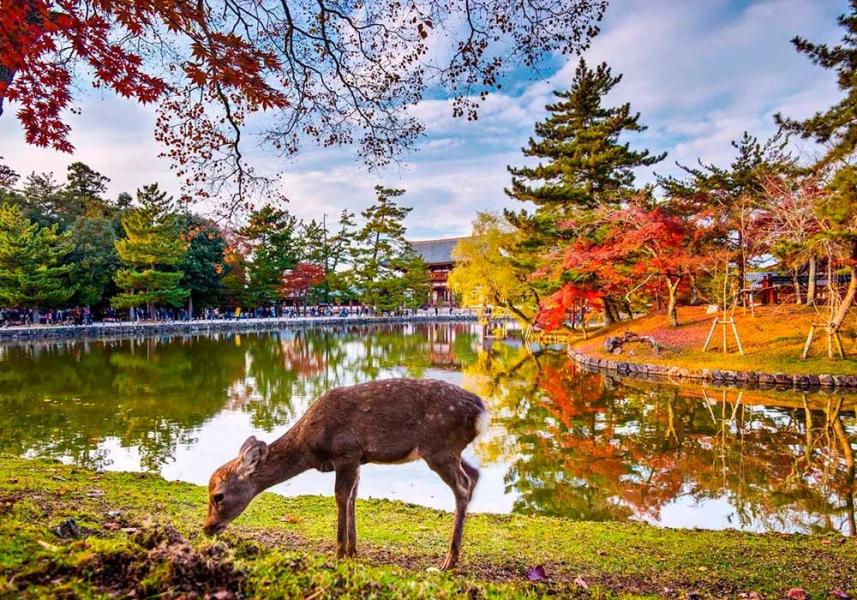 Выселение из отеля. Переезд в Нару - небольшой город, когда-то бывший столицей Японии, всего в часе езды от Киото - жемчужина истории и культуры, гордящаяся своими храмами, причисленными к мировому культурному наследию ЮНЕСКО. Величественный храм Большого Будды Тодайдзи, который и сейчас впечатляет своим размахом одного из самых больших деревянных строений в мире и невероятная по размерам бронзовая статуя. И, конечно, один из главных символов Нары - великое множество оленей, беспечно гуляющих по лужайкам вокруг этих храмов и охотно лакомящихся угощениями от любопытствующих посетителей. Олени в Наре на протяжении столетий считались священным животным, а сейчас еще и охраняются государством, как уникальное культурно-природное наследие.