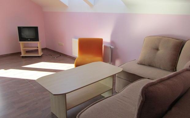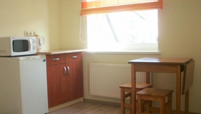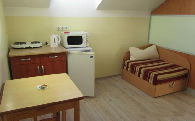 - кухонный блок (холодильник, электроплита, СВЧ-печь, электрочайник, набор посуды)