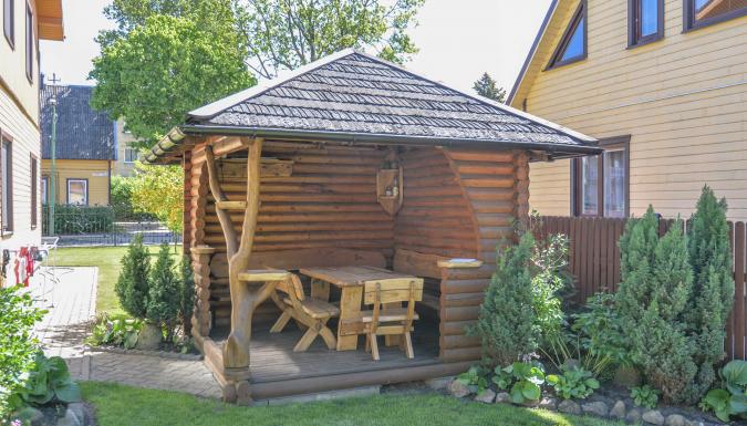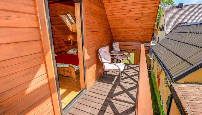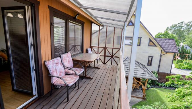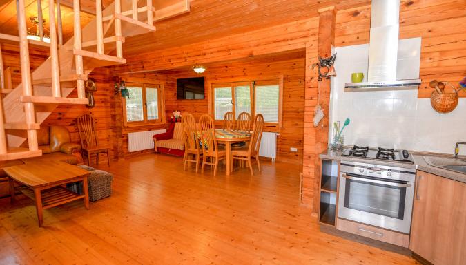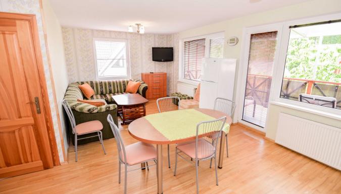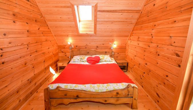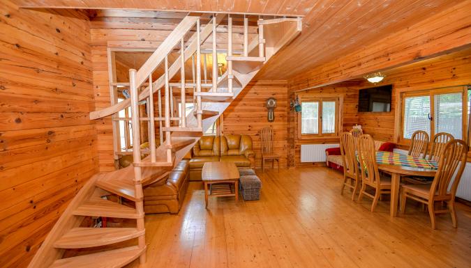 Деревянный коттедж (max 6 чел+2+1.). 1-ый этаж: кухня- гостиная,TV. SH и WC. 2-ой этаж: 2 спальни(2-х спальная кровать + кресло-кровать), TV в каждой комнате, SH и WC. В одной из комнат балкон.