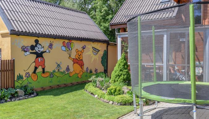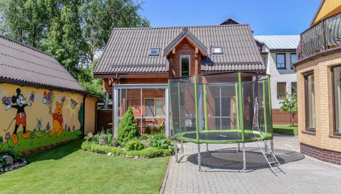 Во дворе есть уютная беседка и место для парковки автомашин. Для детей во дворе есть качели и батут. Недалеко от виллы магазины, кафе, рестораны, рынок, детская площадка, прокат велосипедов.