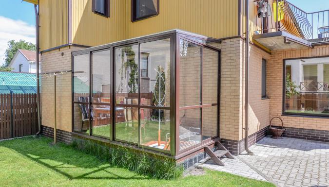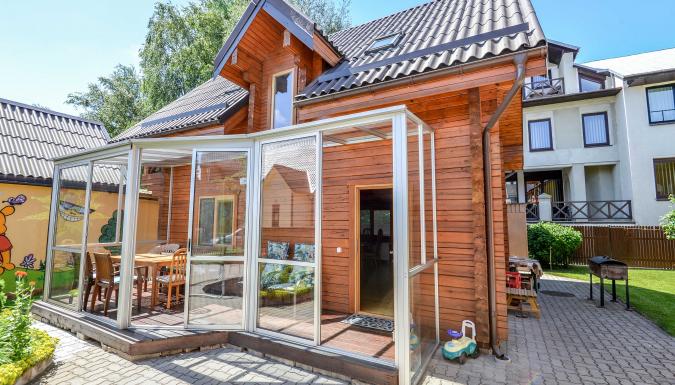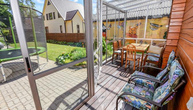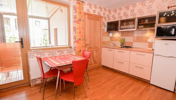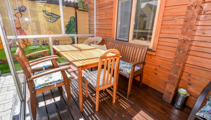 Апартаменты с террасой. 1-комнатный номер с террасой на 1 этаже с отдельным входом. В комнате 2-спальная кровать, диван, TV, WI-FI, кухонное оборудование (плита, чайник, микроволновка, холодильник, посуда, стол, 4 стула). Санузел (душевая кабина, WC). Большая застекленная терраса с мебелью для уютного семейного отдыха.