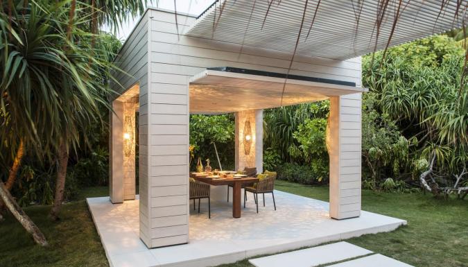 9 Garden Water Villa - One Bedroom (240 м2; макс. 2+2 чел.). Виллы, наполовину расположенные над водой. Частный мини-садик, спальня с видом на океан, ванная комната с ванной и душем. Просторная надводная терраса с обеденным павильоном, зоной отдыха, душем на открытом воздухе, бассейном - каскадом (длина – 12.5 м), прямым спуском в воду. Часть вилл выходит на сторону лагуны, часть – на океан, риф.